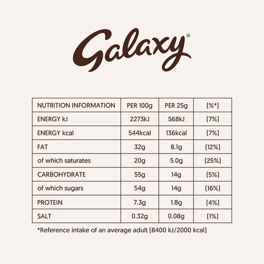 Indulge in the bliss of our exquisitely crafted Galaxy Smooth Milk chocolate bar with its velvety smoothness and irresistible melt-in-the-mouth sensation, it’s a treat that will leave your taste buds dancing. Its a perfect sharing snack bar created for special moments with significant people. This Galaxy Smooth Milk chocolate bar makes a gorgeous chocolate gift, a superb stocking stuffer, and a classic component for a deluxe chocolate hamper. Take time to settle on the sofa, flick on your comfort film, and enjoy an evening to yourself with irresistibly luscious chocolate. You know you’ve earned it. Suitable for vegetarians and certified by Rainforest Alliance. 1x Galaxy Smooth Milk Chocolate bar 360g